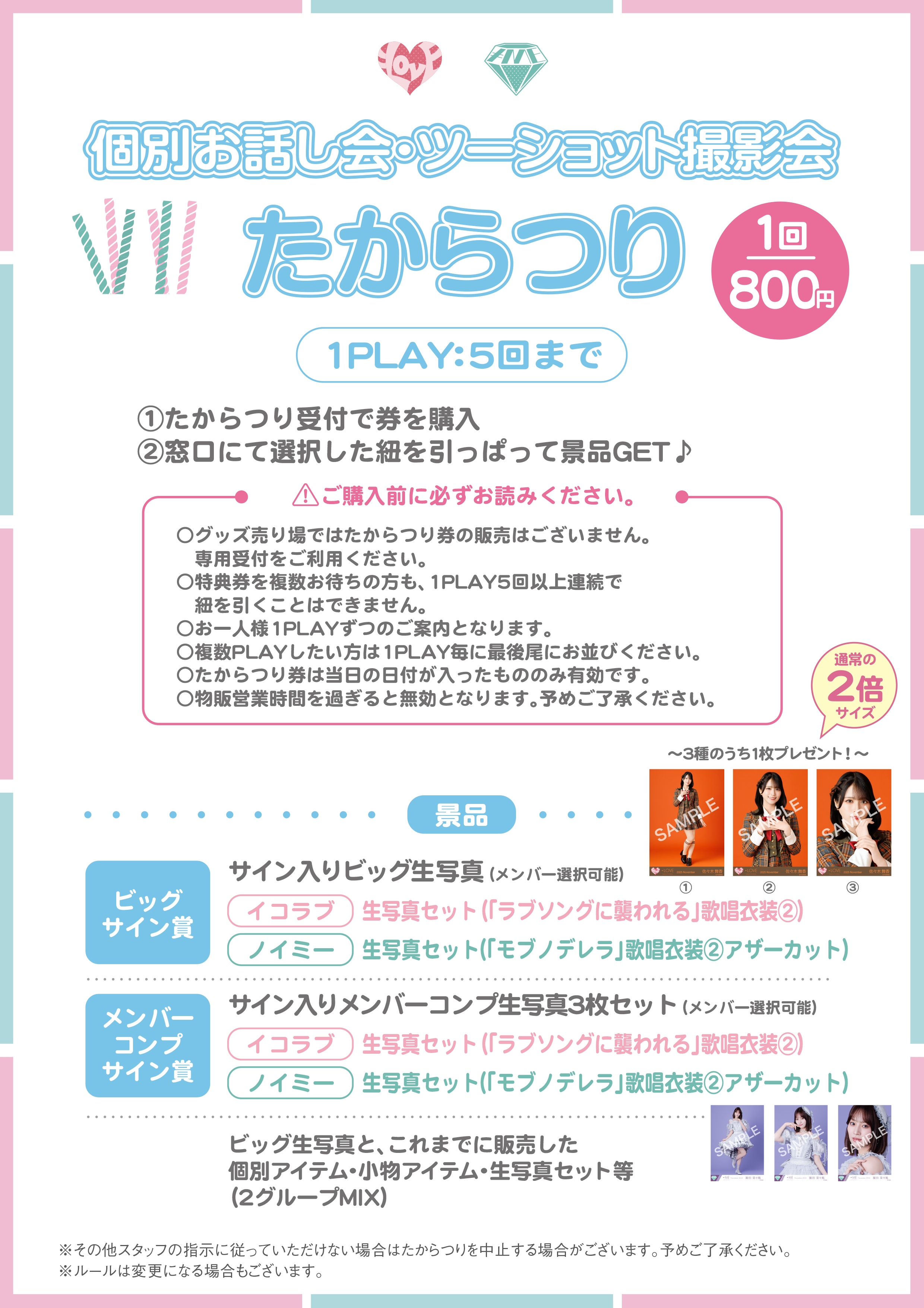 ・その他スタッフの指示に従っていただけない場合は、イベント参加資格の取消や、物販購入をお断りさせていただくことがございます。予めご了承ください。